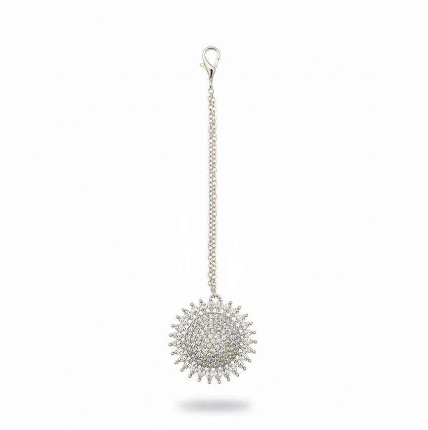 Elegant AD stone work maang tikka with premium silver polish, perfect for weddings, parties, and festive ethnic looks.