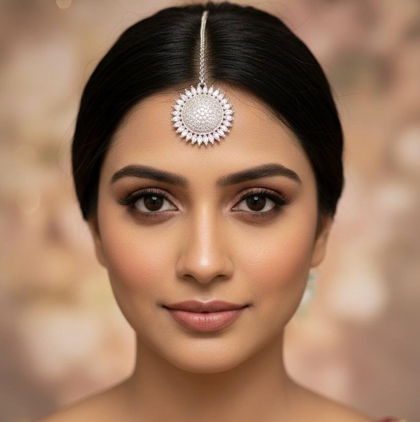 Add a graceful touch to your jewellery collection with this beautiful AD stone work maang tikka crafted with sparkling American diamond stones and finished with a fine silver polish. The elegant silver maang tikka design enhances your traditional style and pairs perfectly with saree, lehenga, and ethnic suits. Ideal for wedding wear, festive jewellery, and party occasions, this traditional AD stone tikka for women offers a classy and royal look while remaining lightweight and comfortable to wear.