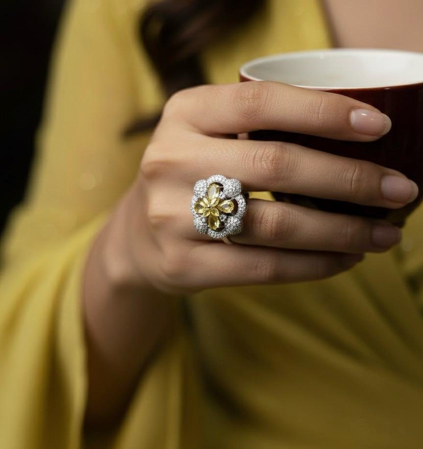 Add a cheerful touch of sparkle to your jewellery collection with the Sunlit Silver Spark American Diamond Finger Ring. Crafted with shimmering American diamond stones and enhanced by a graceful combination of silver and yellow stone work, this ring features a sleek silver polish that gives it a fresh and modern appeal.