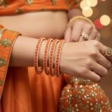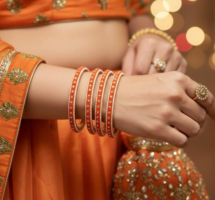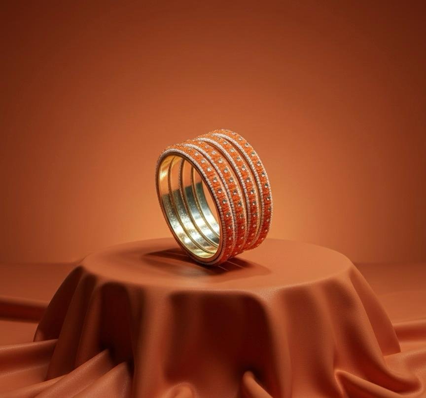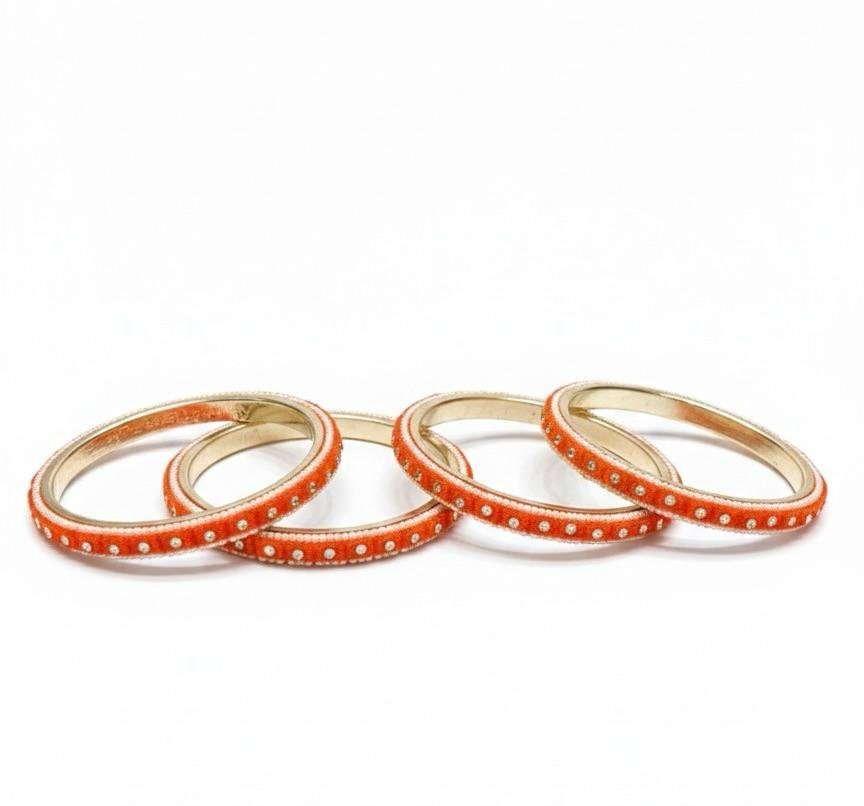 Vibrant 4-piece brass bangle set in orange with elegant gold polish finish ✨️. Lightweight, festive-ready & perfect for traditional wear .