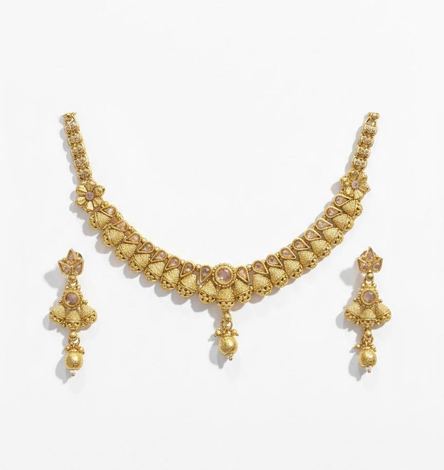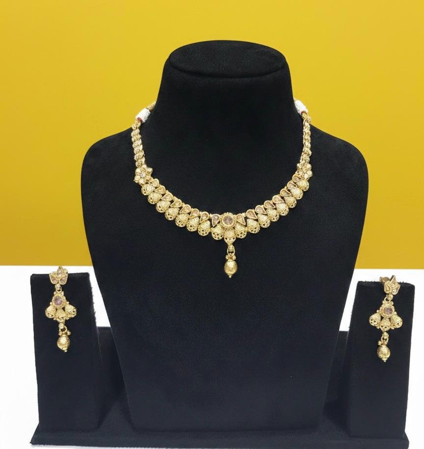 This elegant set includes a finely designed necklace paired with matching earrings, offering a complete and graceful ethnic look. Lightweight and comfortable to wear, it pairs effortlessly with sarees, lehengas, and traditional outfits. A perfect blend of heritage elegance and classic style, this set also makes a thoughtful gifting option.