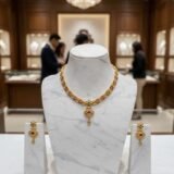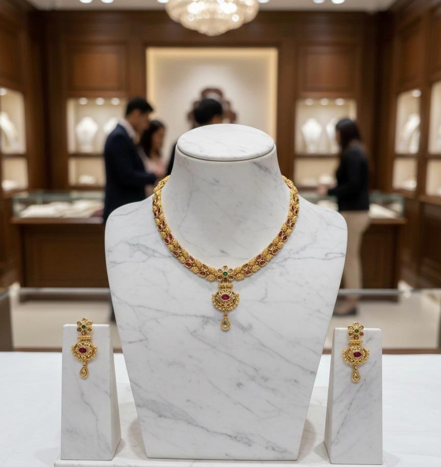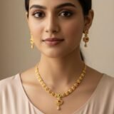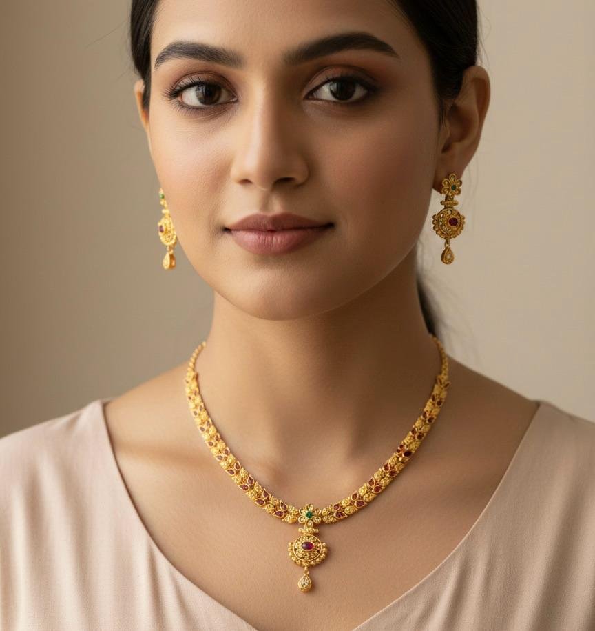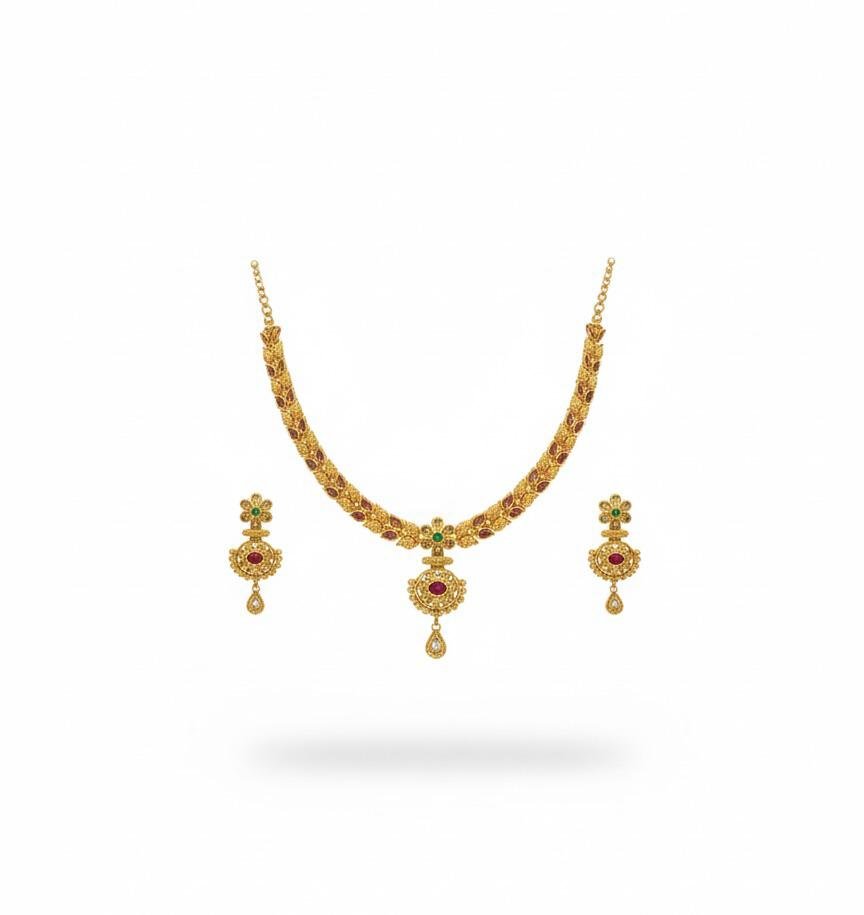 This exquisite set includes a finely designed necklace paired with matching earrings, making it perfect for weddings, festivals, poojas, and special occasions. Lightweight and comfortable to wear, it complements sarees, lehengas, and traditional outfits effortlessly. A perfect blend of heritage craftsmanship and luxurious style, this set also makes a thoughtful gifting option.