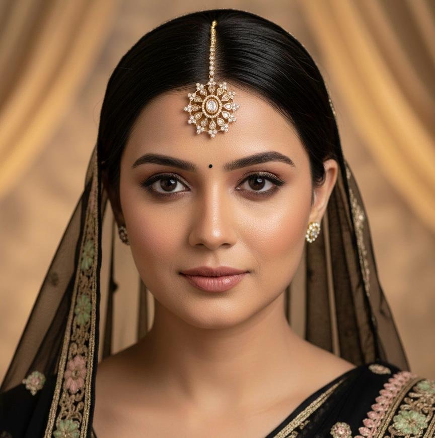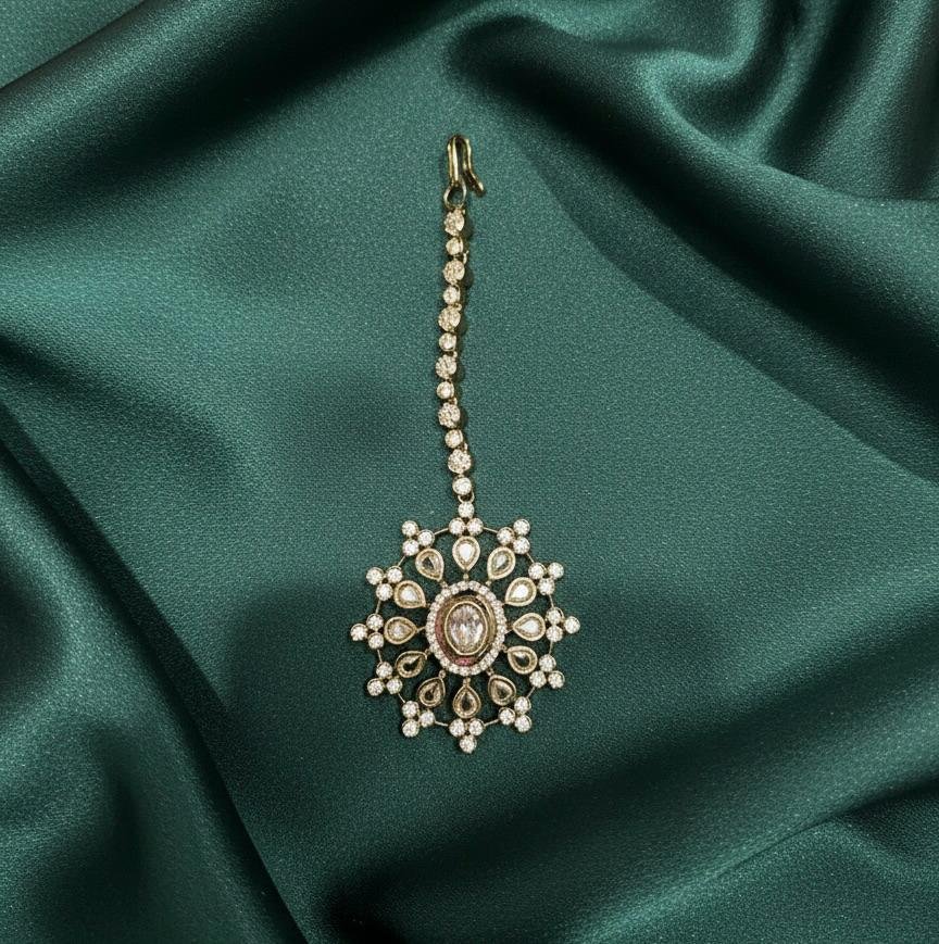 Elegant maang tikka crafted with beautiful AD work and finished with rich mehndi polish for a classic traditional look.