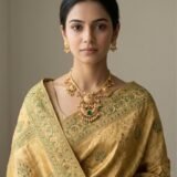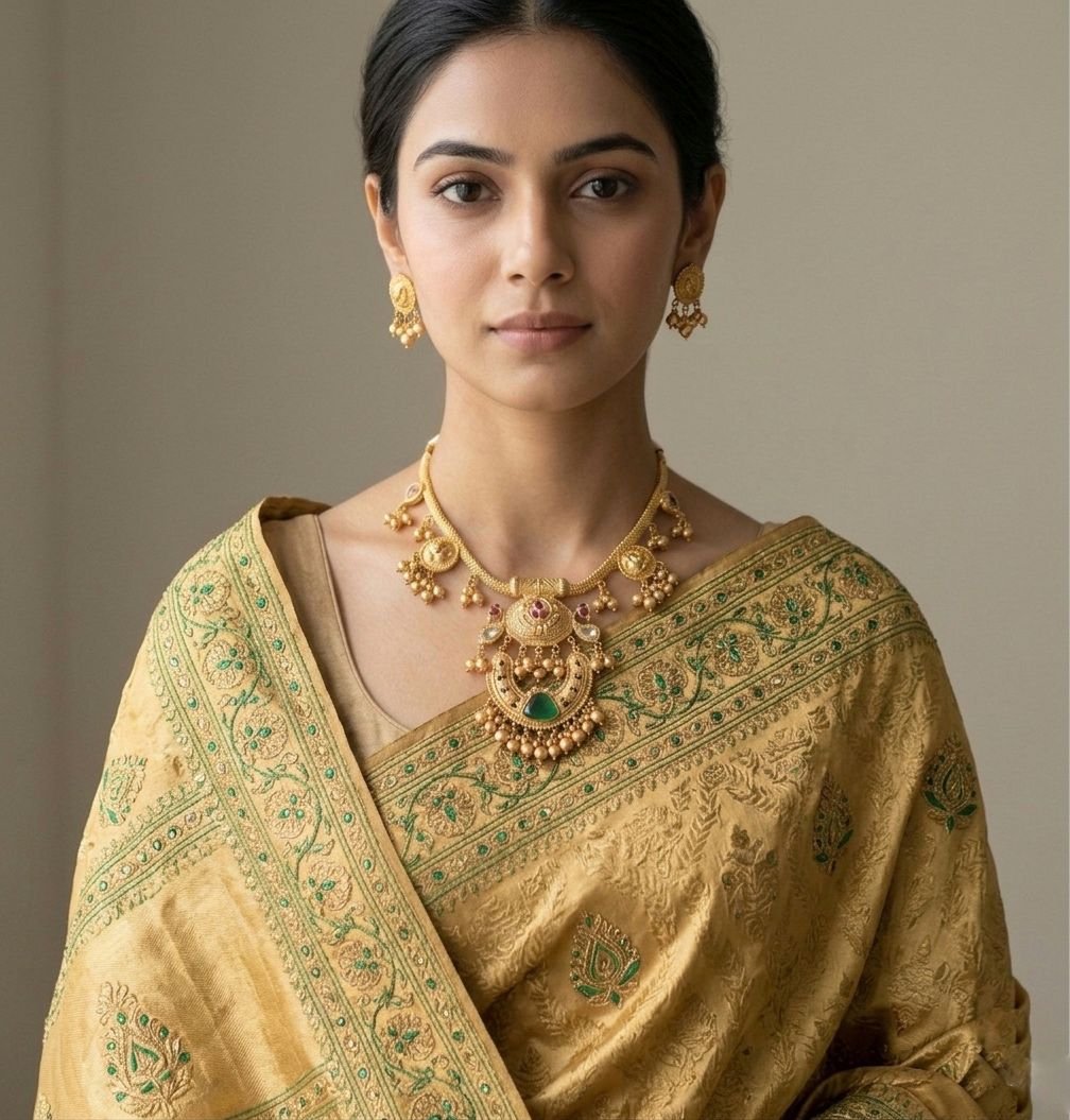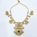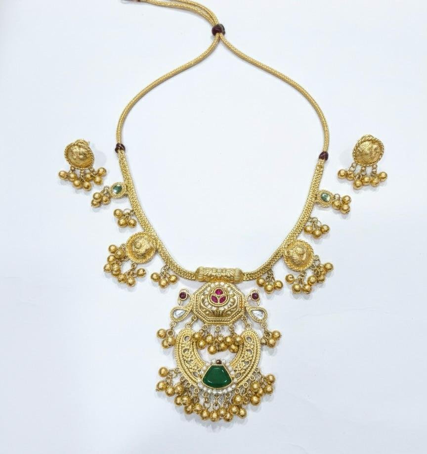 The rich gold polish finish enhances its antique appeal, while the green stone detailing adds a graceful and refreshing contrast. Perfect for weddings, festive celebrations, cultural events, and traditional functions, this necklace set pairs effortlessly with silk sarees, lehengas, and ethnic attire.